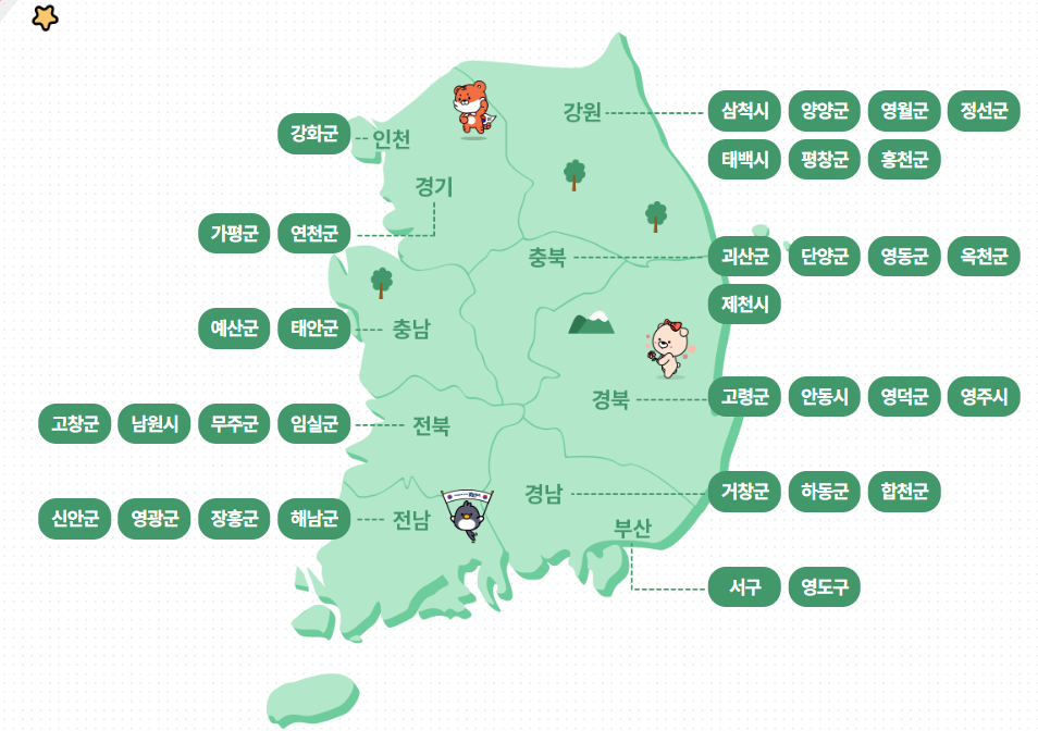 인구 감소 위기를 겪고 있는 지역의 관광 활성화를 위한 사업으로, 강원 경기 경남 경북 부산 인천 전남 전북 충남 충북 지역에서 즐길거리, 음식 등 여러가지 지역 혜택을 제공하고 있습니다.